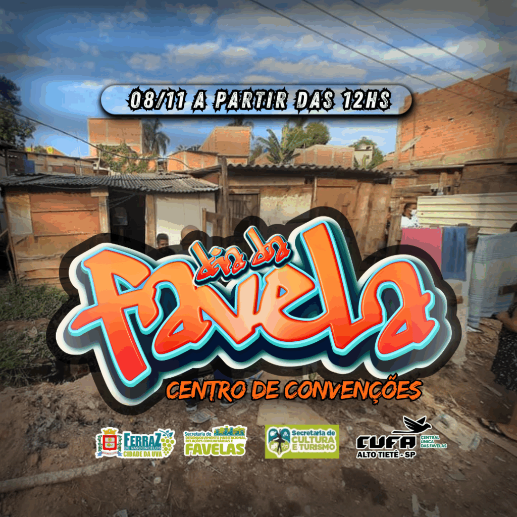 Festa da favela em comemoração ao dia da favela será comemorado dia 08/11 com shows ao vivo de samba, rap e funk.